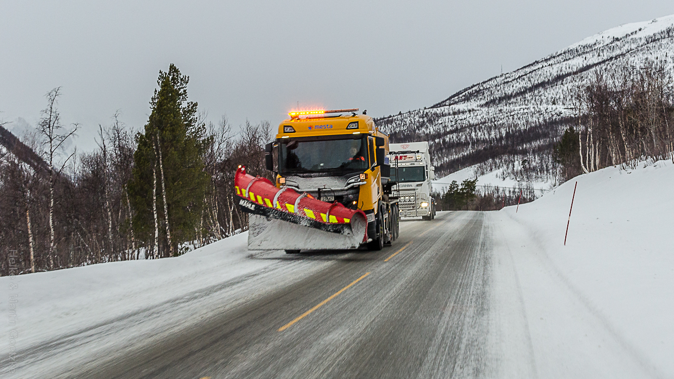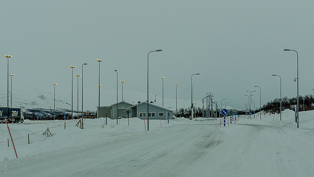 Die Temperaturen steigen und steigen. Bis zum LKW-Kontrollpunkt an der norwegisch-schwedischen Grenze ist noch alles ziemlich in Ordnung. Mit dem Schnee! Das Wetter ist schon grau und . . . bedeckt. Danach wird es immer grauer. Irgendwann begegnet uns ein Schneeschieber, der schon nicht mehr schieben muss. Dann sind die Straßen grau, d.h. schnee- und eisfrei. Und dann fängt es an zu regnen.