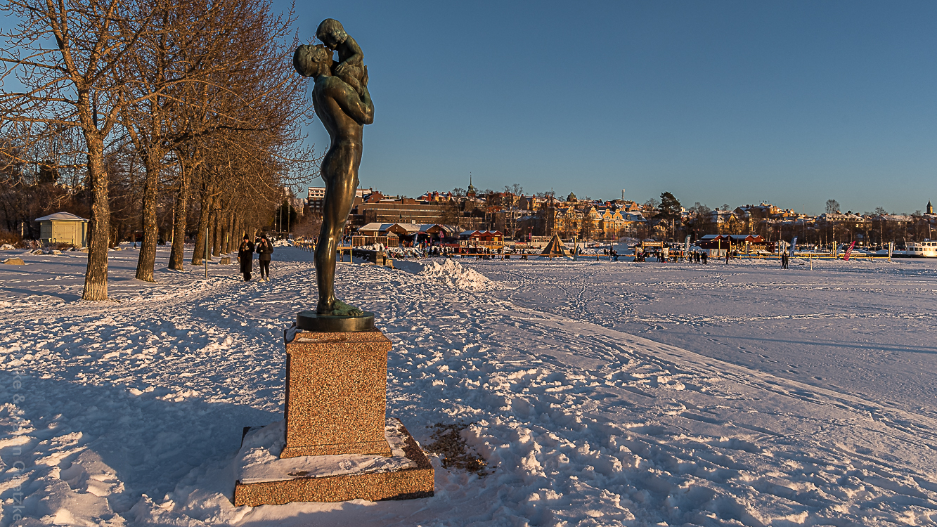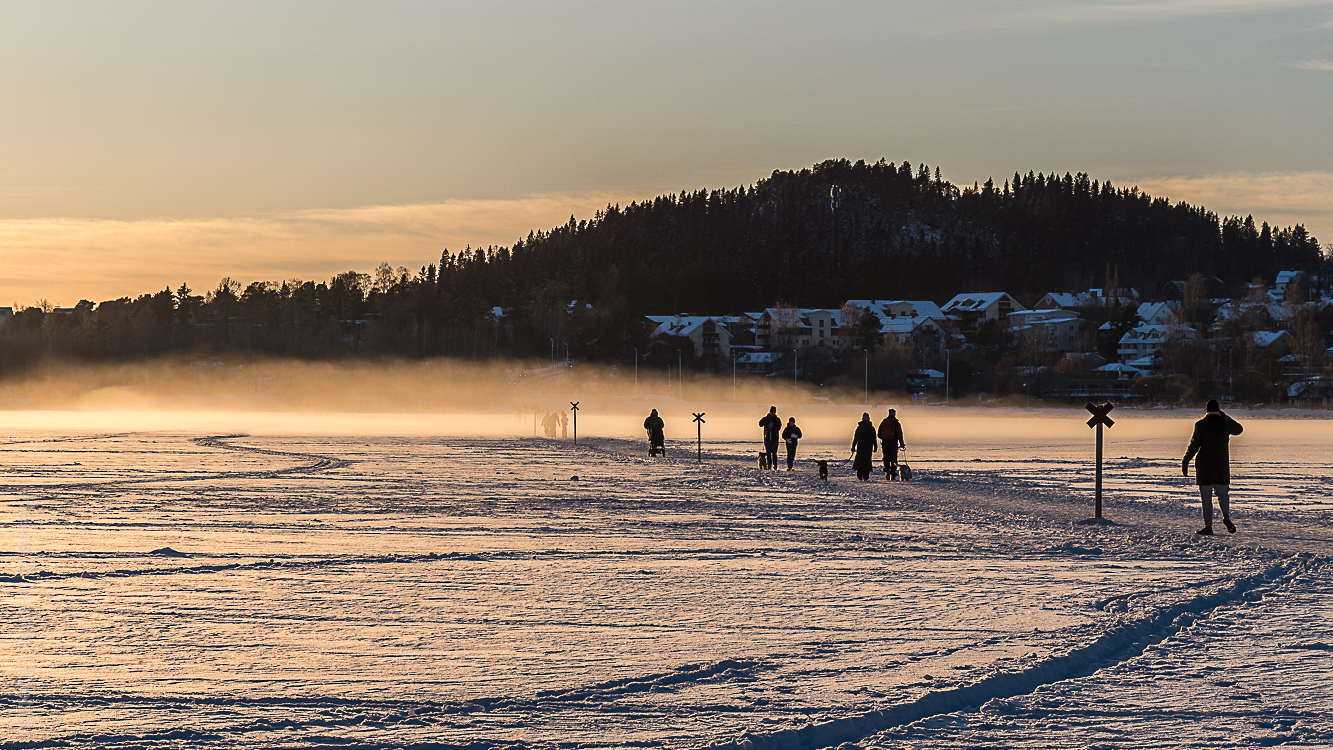 Ich nutze die frühe Ankunft und mache mich mit Kamera auf den Weg ins Stadtzentrum. Weniger um das Stadtzentrum zu fotographieren. Östersund ist keine Augenweide. Ich möchte zum Winterpark. Ein Freizeitvergnügen auf dem See, auf dem Eis des Sees. Jetzt am Wochenende ist dort richtig was los.