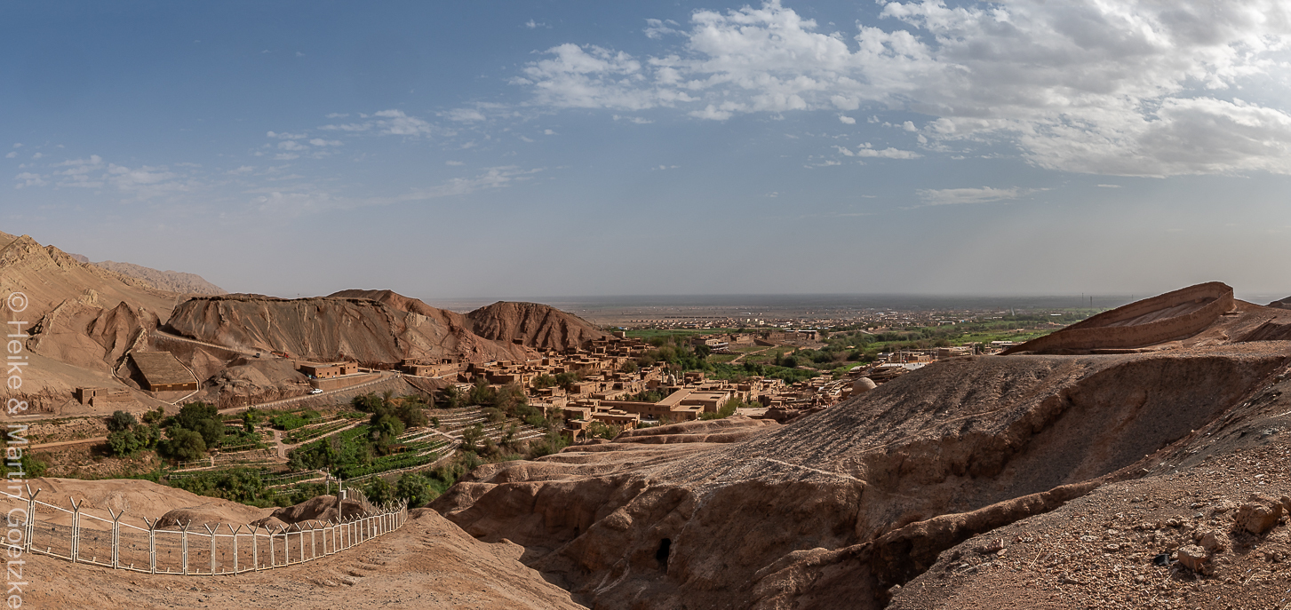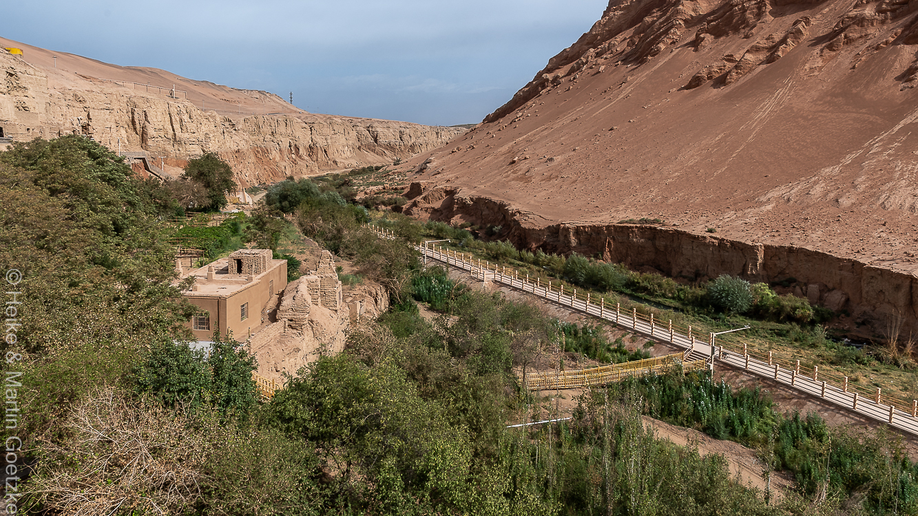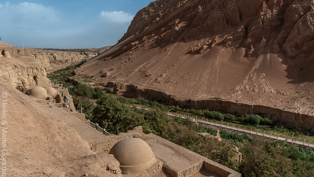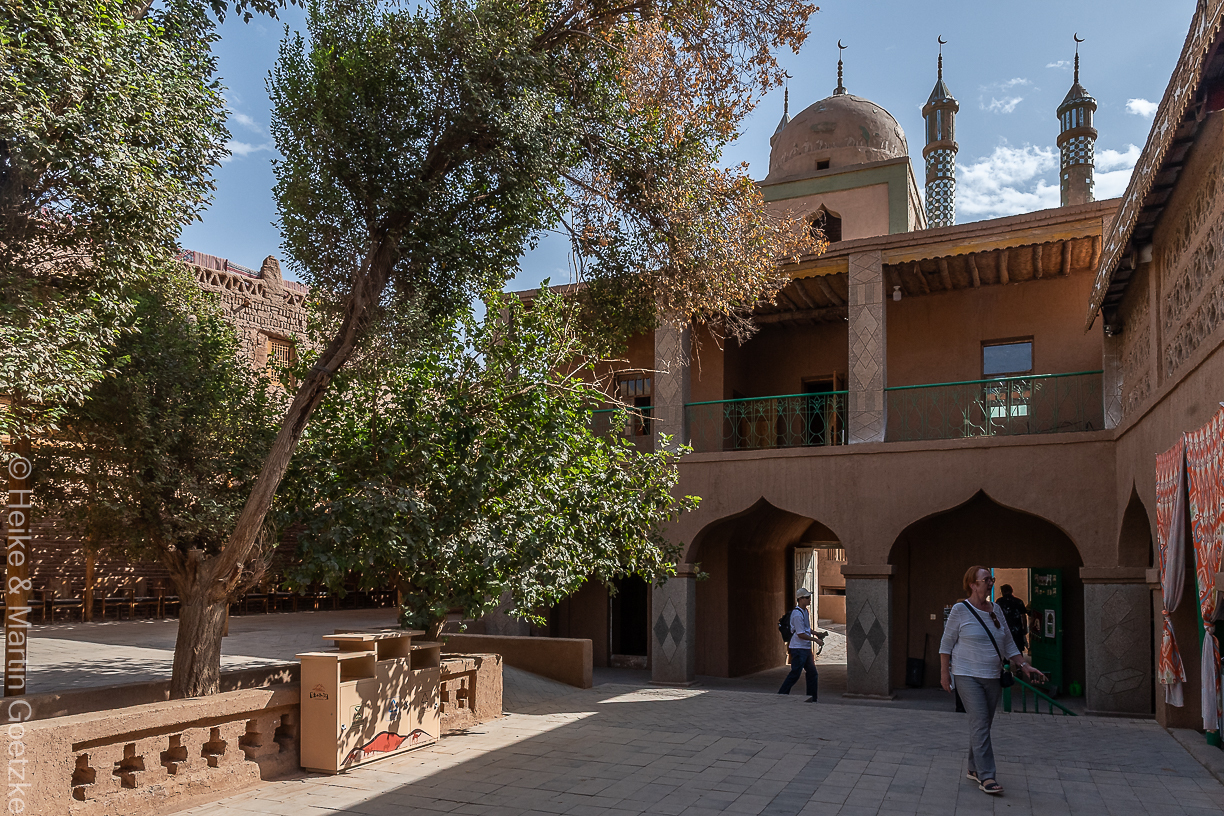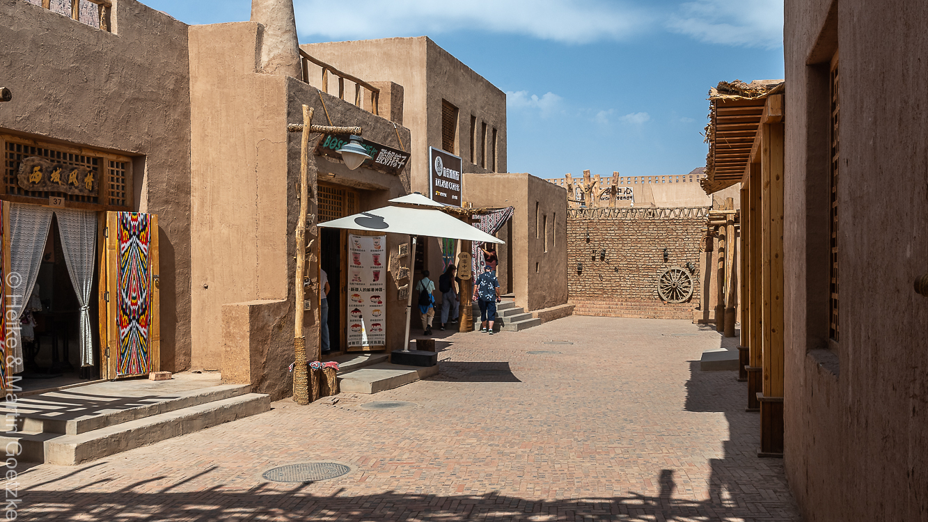 Erst hinter dem Kunstgebilde liegt das alte ehemalige altuighurische Dorf Tuyugou, in dem jedoch auch längst niemand mehr wohnt. Auch diese Einwohner haben offensichtlich die Segnungen der neuen bequemen Bungalows und Wohnungen in der Stadt erfahren. Im alten Dorf essen wir „bei einer uighurischen Familie“ zu Mittag, was nichts anders ist als ein gemütliches Restaurant, betrieben von einer vermutlich uighurischen Familie.