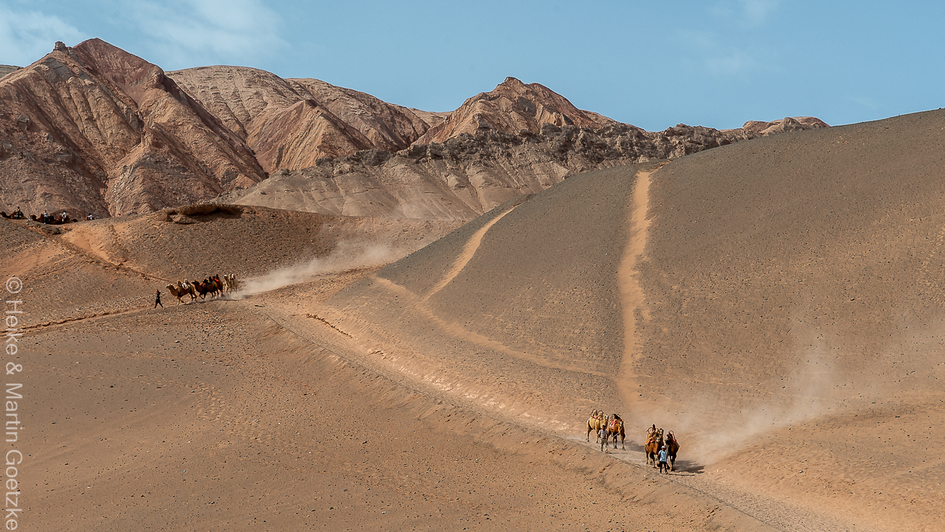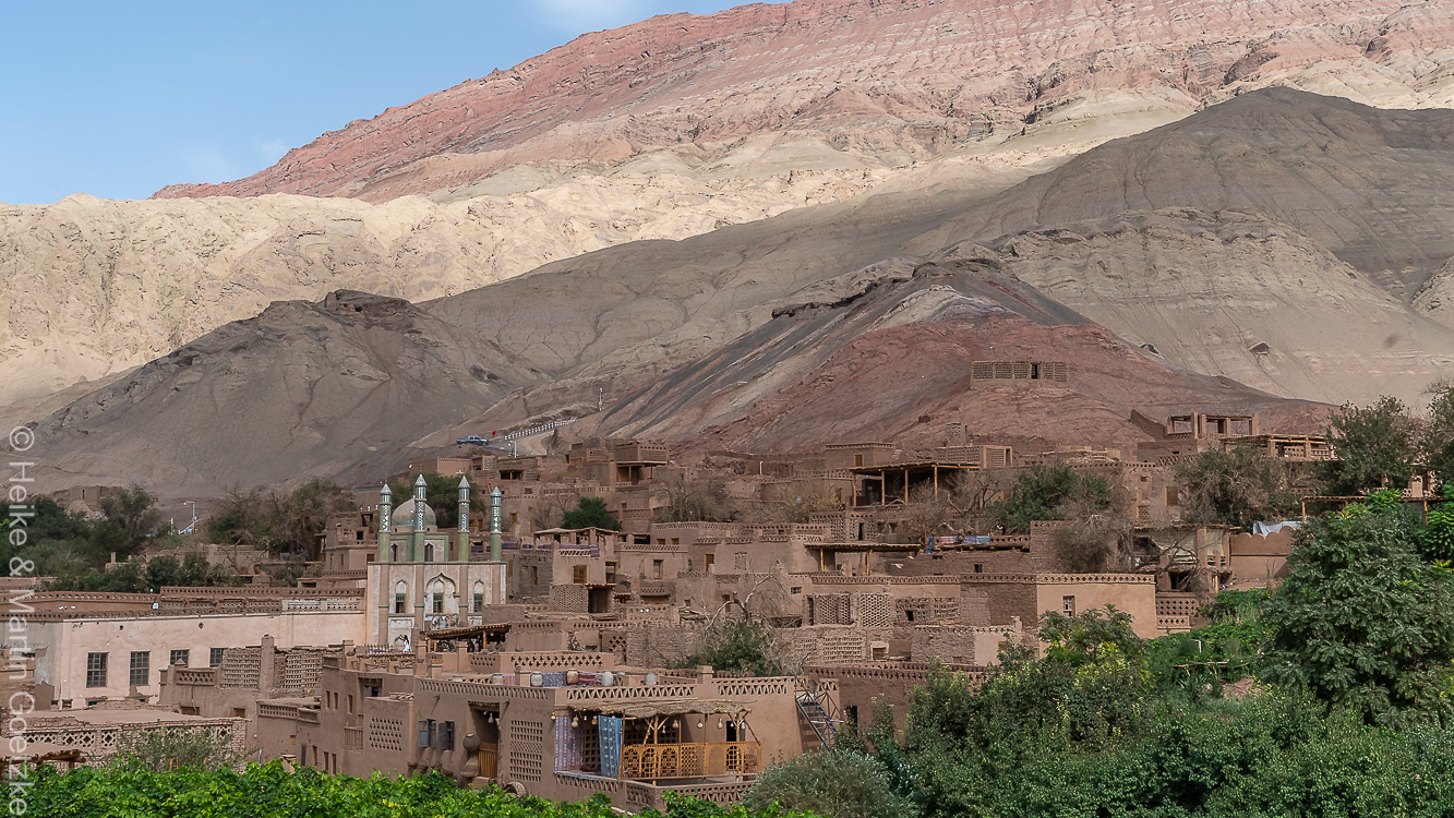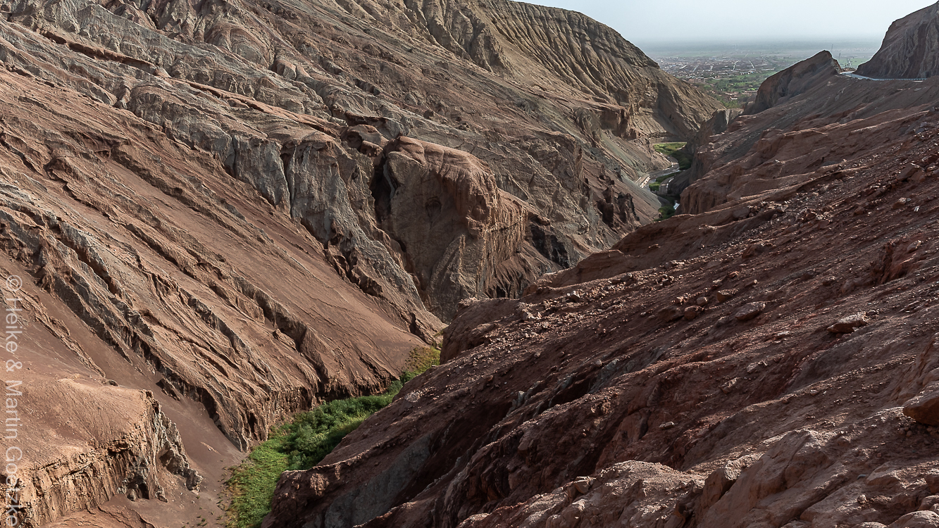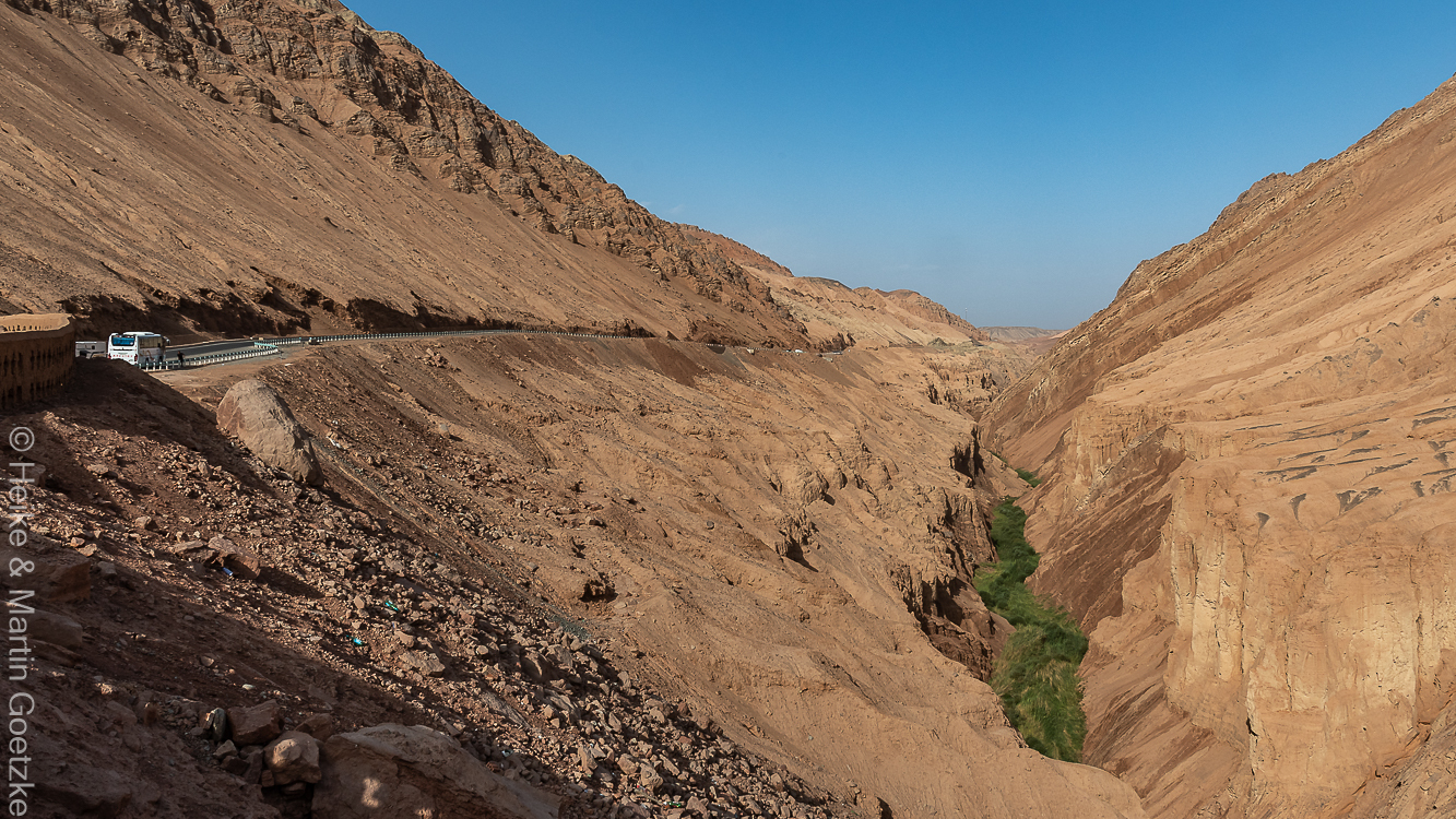 Auf der Rückfahrt nach Turfan begeistern (mich) die trockenen Sand-/Lehmlandschaften mit den schmalen grünen Bändern in den flammenden Bergen, einer kleinen Bergkette, die das mächtige Tienshan Gebirge vom Tarimbecken trennt.