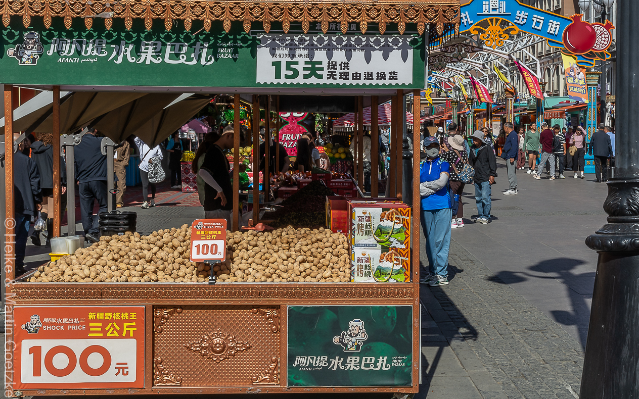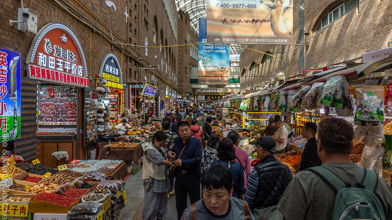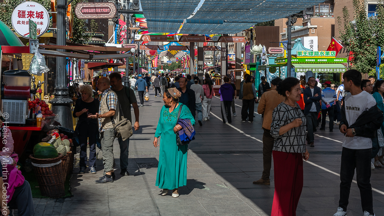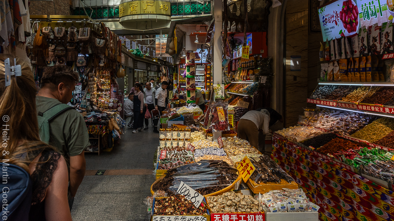 Die Fahrt nach Urumqi durch die Wüstenlandschaft ist eintönig und einschläfernd. Ich weiß nicht wie lange ich weggenickt bin, es muss allerdings ein guter Teil der 2-stündigen Fahrt gewesen sein, den ‚plötzlich‘ sind wir da, in Urumqi (2 Mio. Einwohner, Hauptstadt der Region Xinjiang und Wohnort unseres Guides Yassen). Mit dem Bus quälen wir uns durch dichten Verkehr zum internationalen Bazar.
