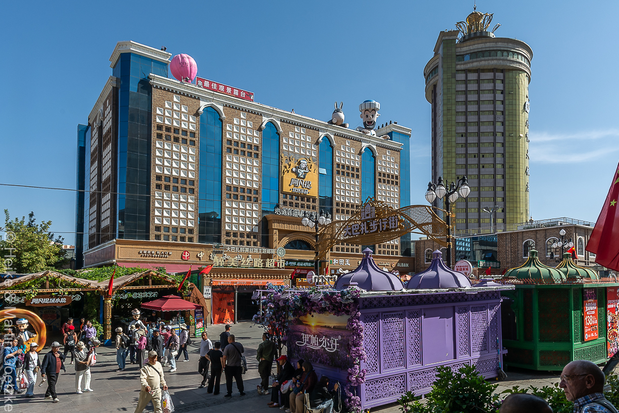 Aus dem Hotelfenster kann ich die folgenden Bilder von der roten Pagode bei Nacht und der Skyline von Urumqi machen, die synchron in verschiedensten Motiven erstrahlt unter anderem einem vom linken zum rechten Hochhaus laufenden Kamel vor einer Wüstenkulisse (habe ich nicht gefilmt).