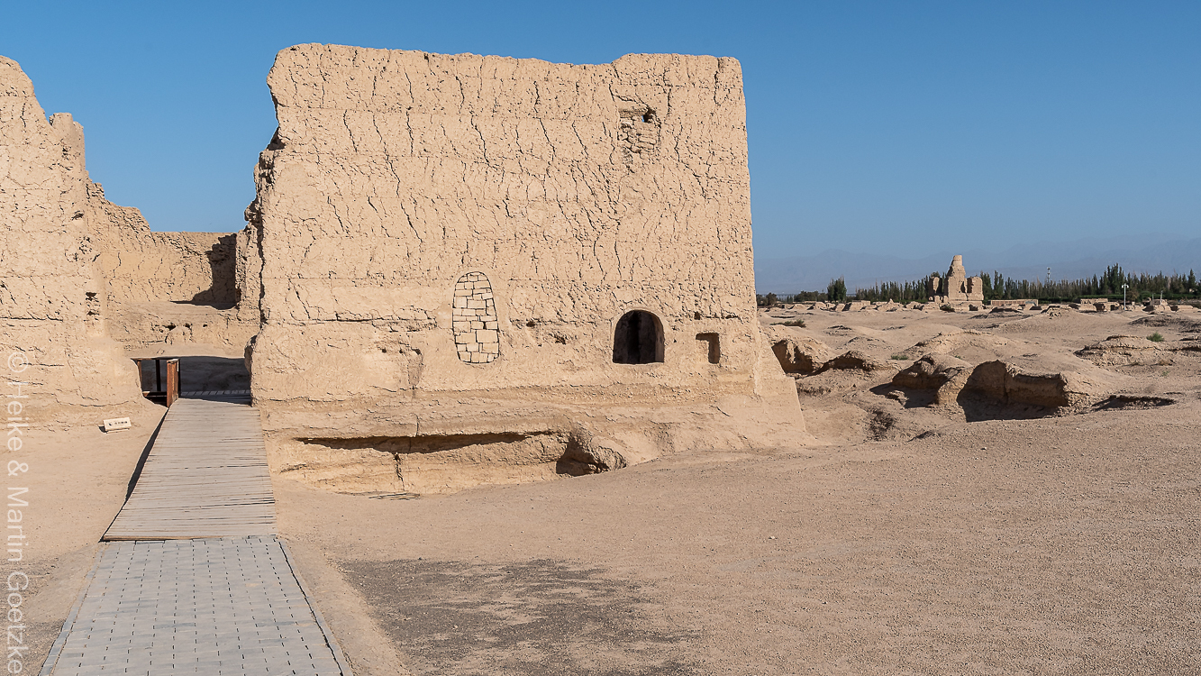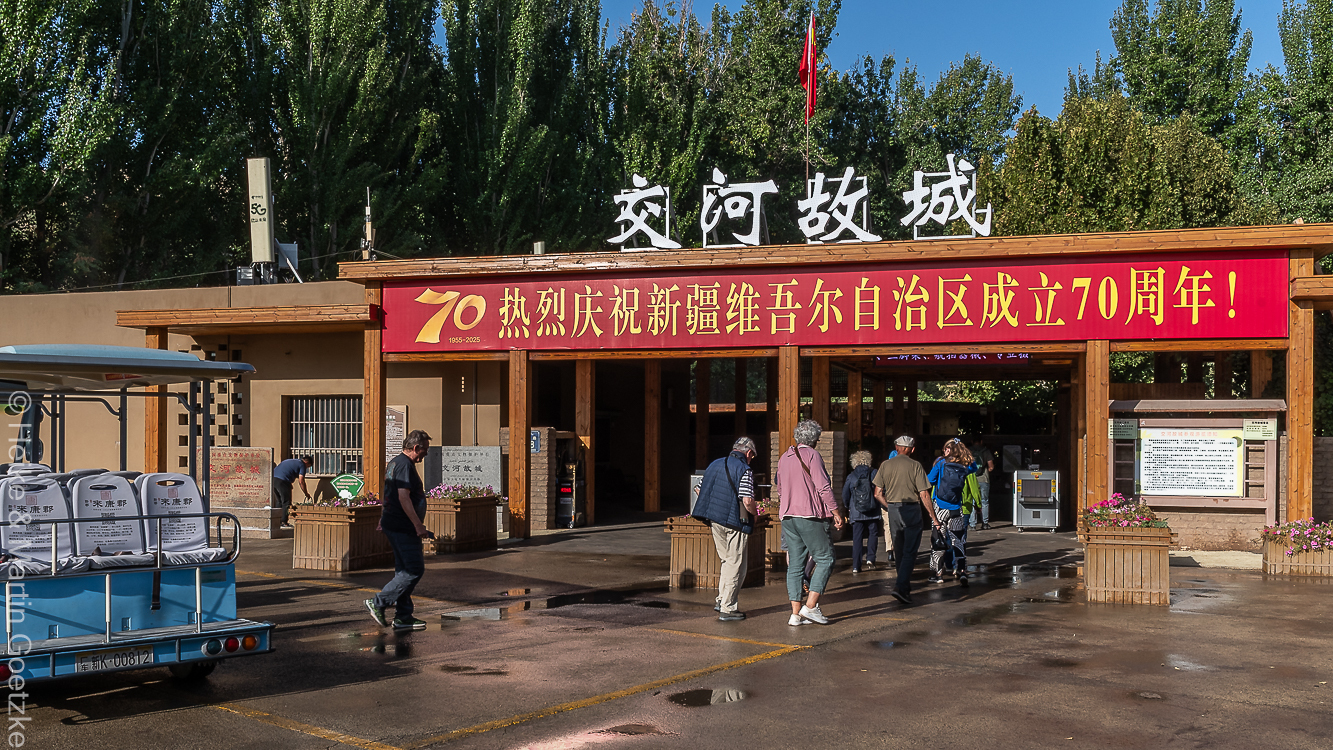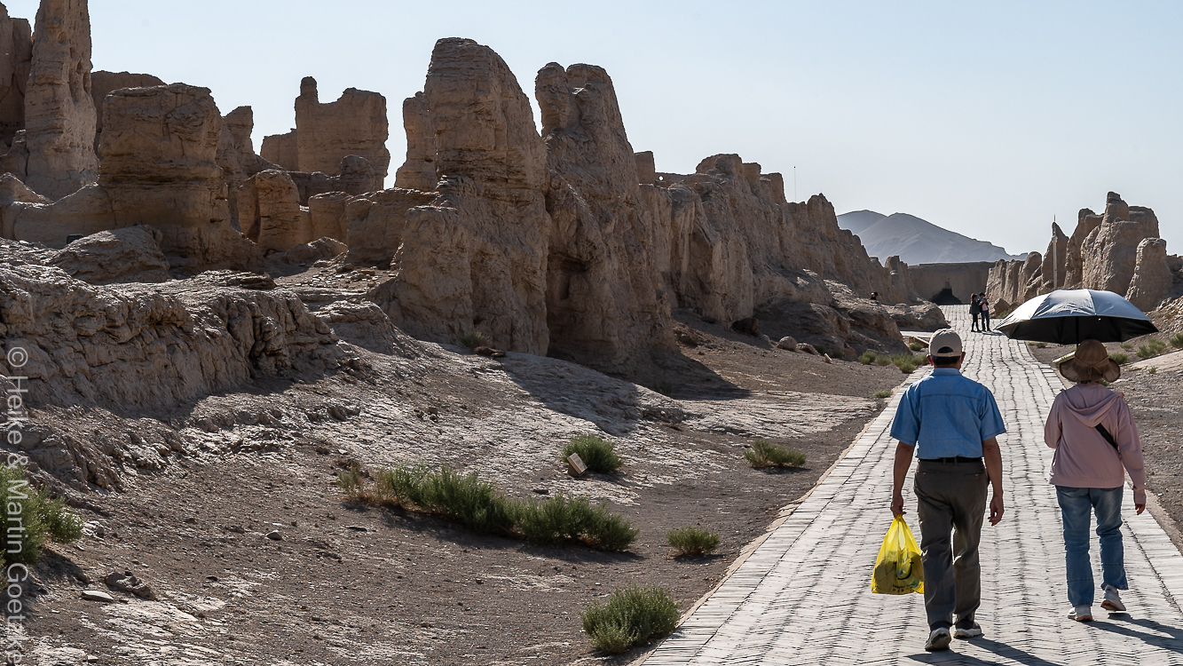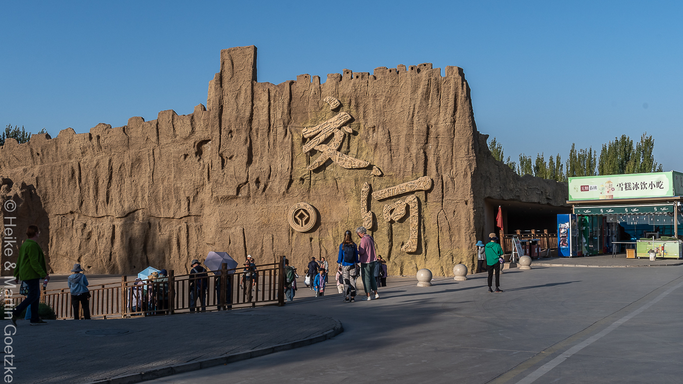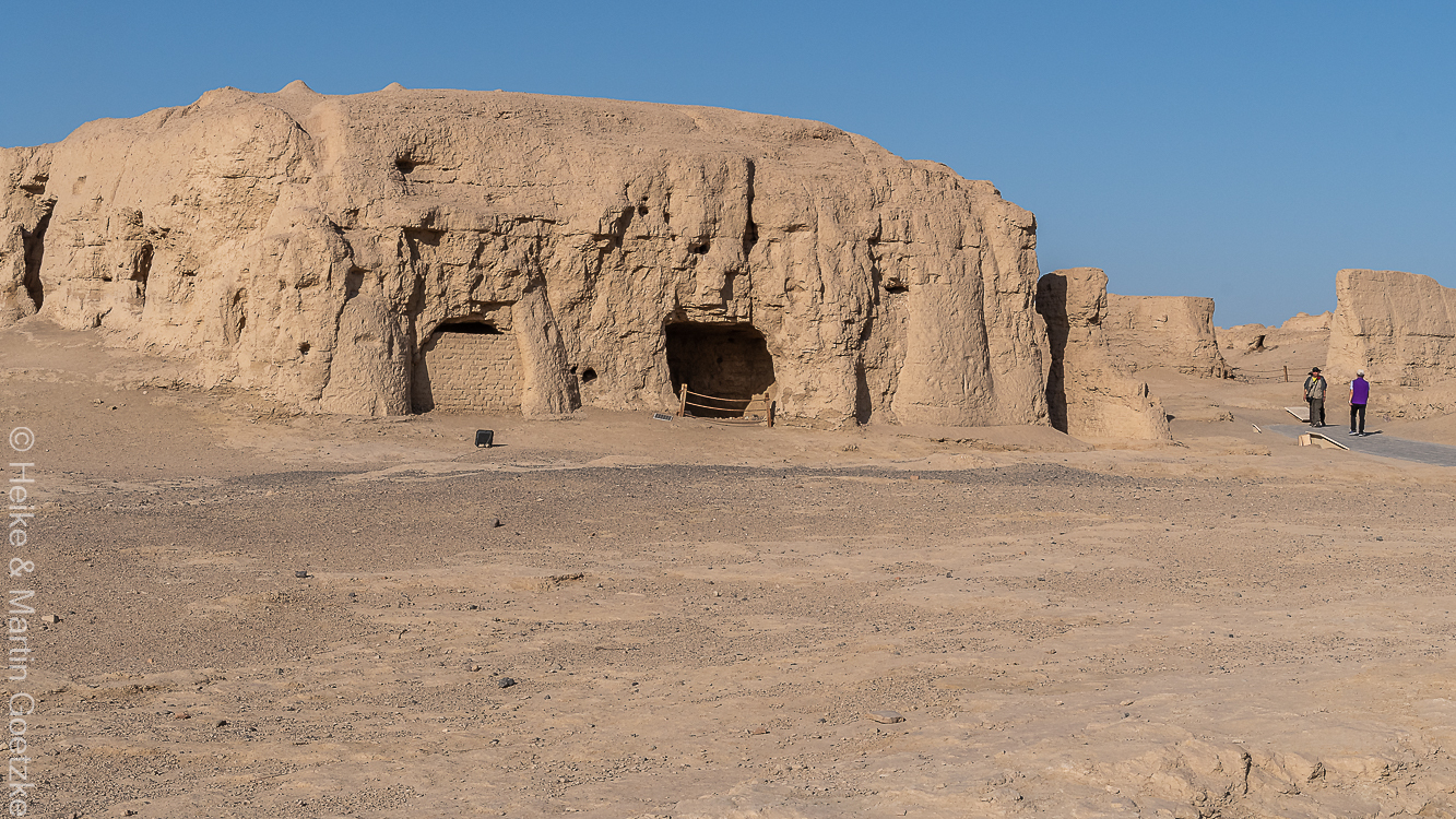 Wir besuchen wieder eine Welterbestätte (seit 2014), die aus Lehm und Sand bestehende Ruinenstadt Jiaohe oder auch Yar-City, eine gigantische Anlage. Sie gilt als die am Besten erhaltene und größte Sand-/Lehm-Ruinenstadt der Welt. Das Exploration Team der Reisegruppe ist vorneweg unterwegs, weil nicht fußlahm, wird aber wg. längerer Verweilzeiten an diversen Stellen alsbald von den anderen Mitreisenden eingeholt.