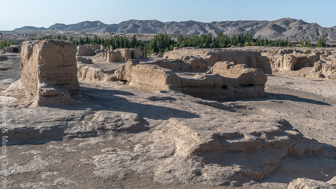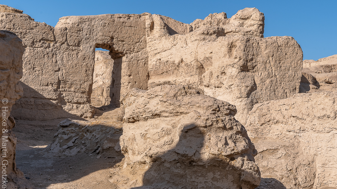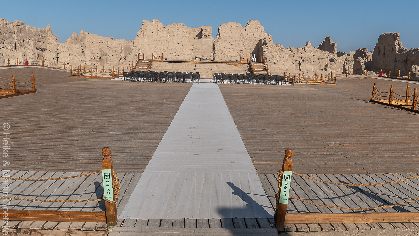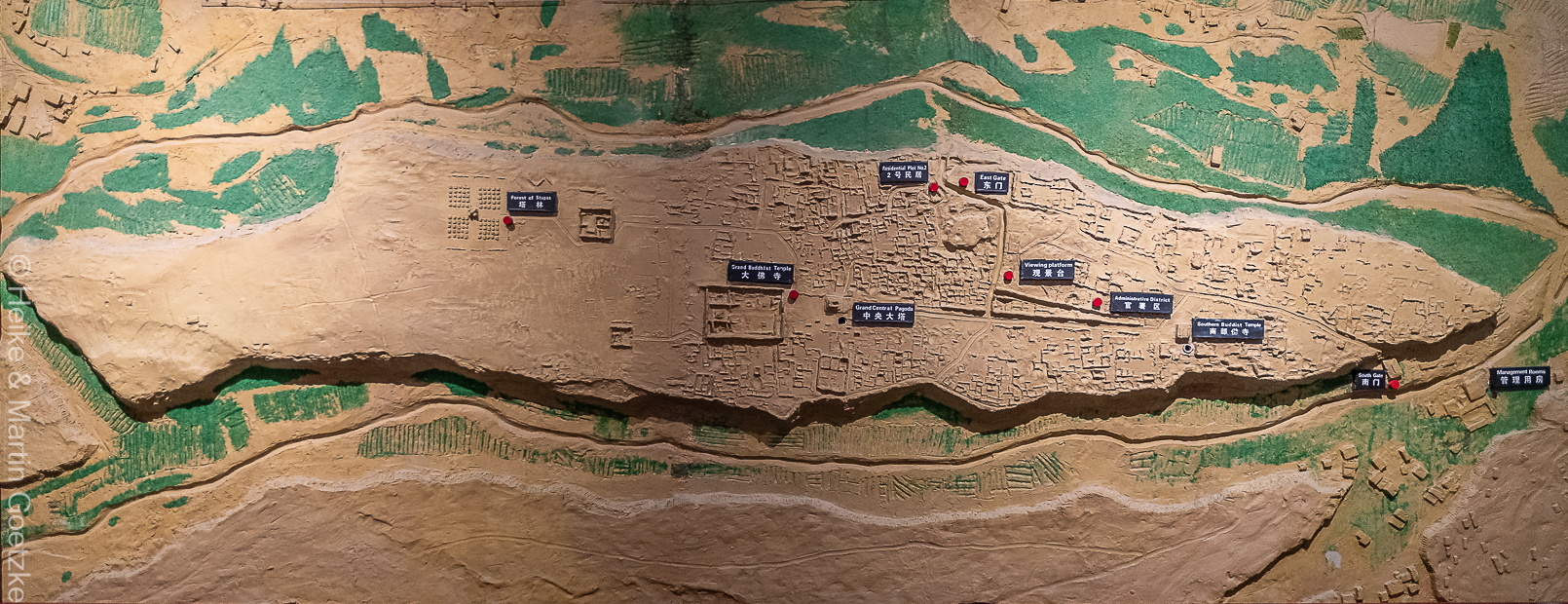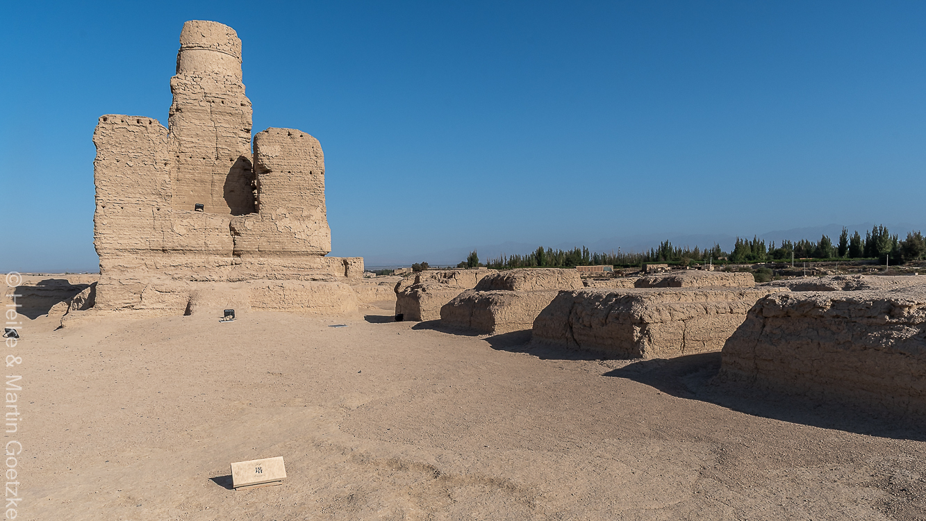 Wir besuchen wieder eine Welterbestätte (seit 2014), die aus Lehm und Sand bestehende Ruinenstadt Jiaohe oder auch Yar-City, eine gigantische Anlage. Sie gilt als die am Besten erhaltene und größte Sand-/Lehm-Ruinenstadt der Welt. Das Exploration Team der Reisegruppe ist vorneweg unterwegs, weil nicht fußlahm, wird aber wg. längerer Verweilzeiten an diversen Stellen alsbald von den anderen Mitreisenden eingeholt.