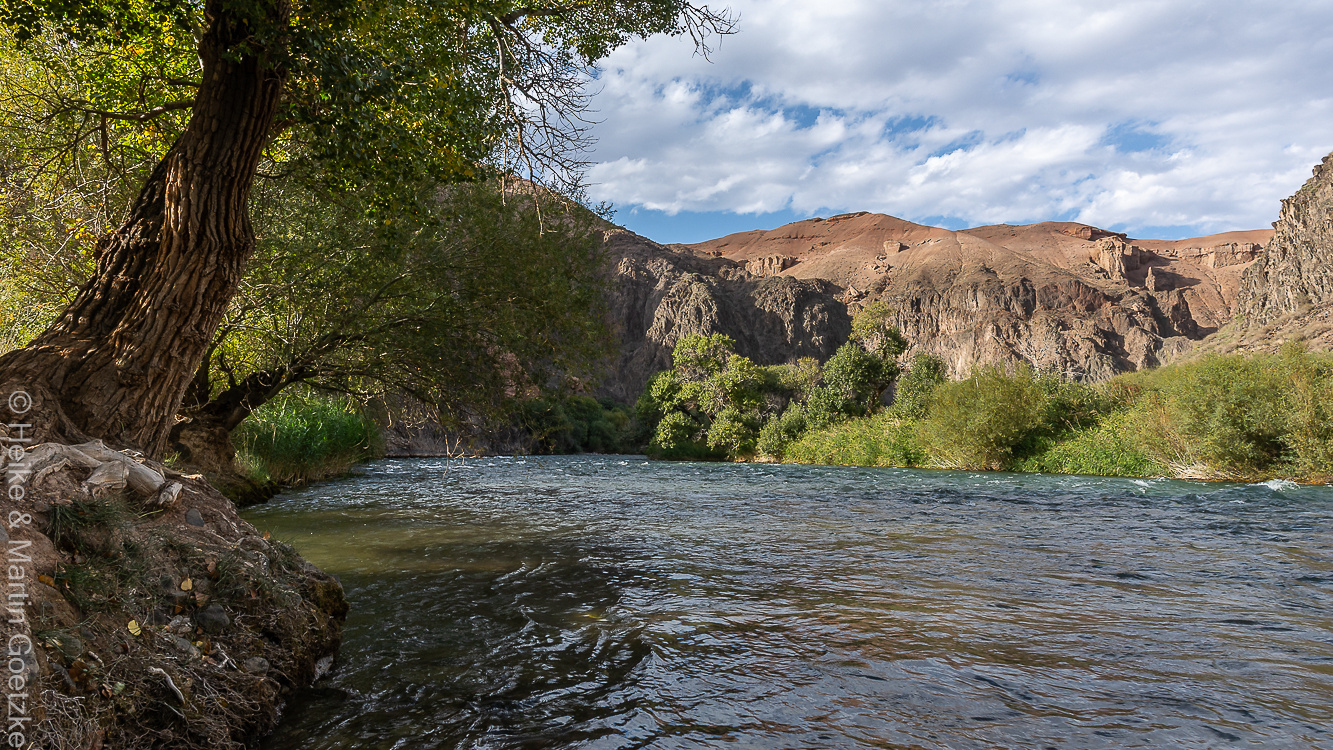 An einer nach Oase aussehenden Stelle machen wir einen weiteren Stop. Irgendwo, aber nicht hier (!) sollen 700 Jahre alte Bäume stehen. An dieser Stelle soll mal Uran abgebaut worden sein. Hmmm. Von Bergwerksaktivitäten sehe ich nicht viel. Sieht nach Oase aus. Es gibt auch eine Quelle.