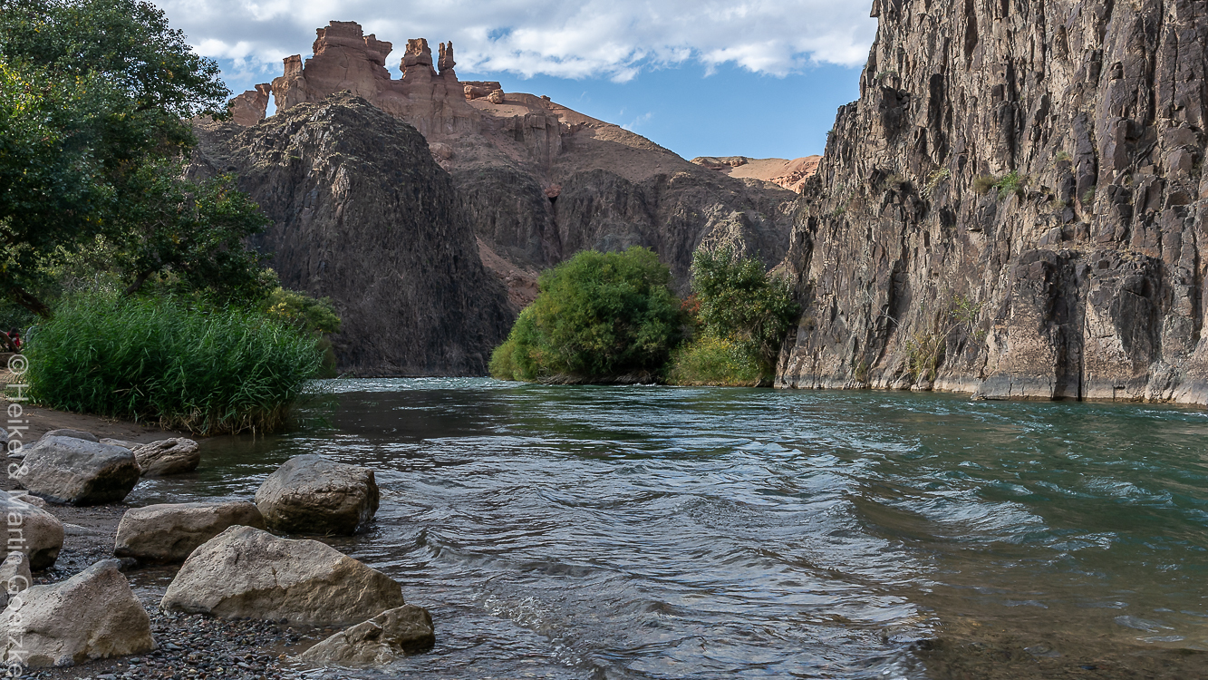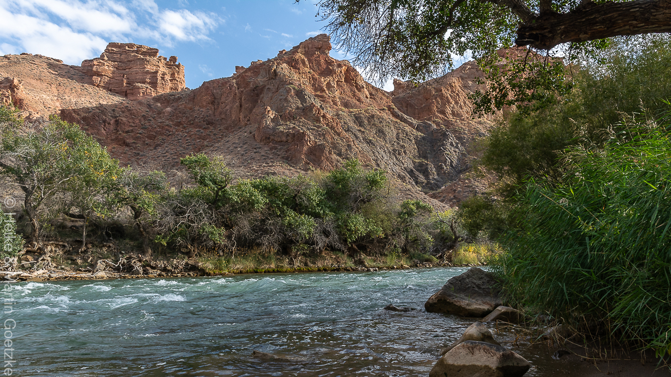 Die Tatras reizen allerdings auch uns. Das sah ja schon abenteuerlich und cool aus . . . .Das wollen wir auch! Unsere Guide kauft für uns die notwendigen Tickets. Die Abfahrtzeiten sind organisiert. Wir müssen auf unseren Tatra noch eine Zeitlang warten. Ich habe Zeit das Flußtal zu erkunden. Das Wasser ist sehr kalt. Ich finde den Kontrast zwischen dem Wasser als Symbol der Fruchtbarkeit und des Nahrungsüberflusses und dem trockenen Lehm-/Sandboden als Symbol für Steppe, Wüste, Trockenheit sehr spannend. Das nur schmale Band des grünen Bewuchses beidseitig des Flusses unterstützt diesen Kontrast noch mehr.