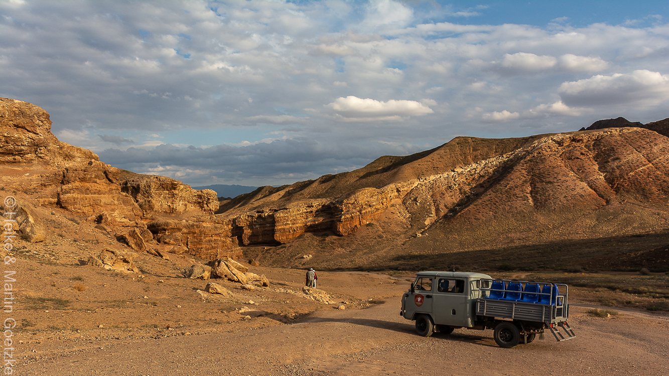 Unser Exploration Team hat Glück, wir kommen auf die Ladefläche. Andere Mitreisende müssen drinnen sitzen (und sehen natürlich nicht so viel). Jetzt ist das Licht vollständig anders. Goldene Stunde.