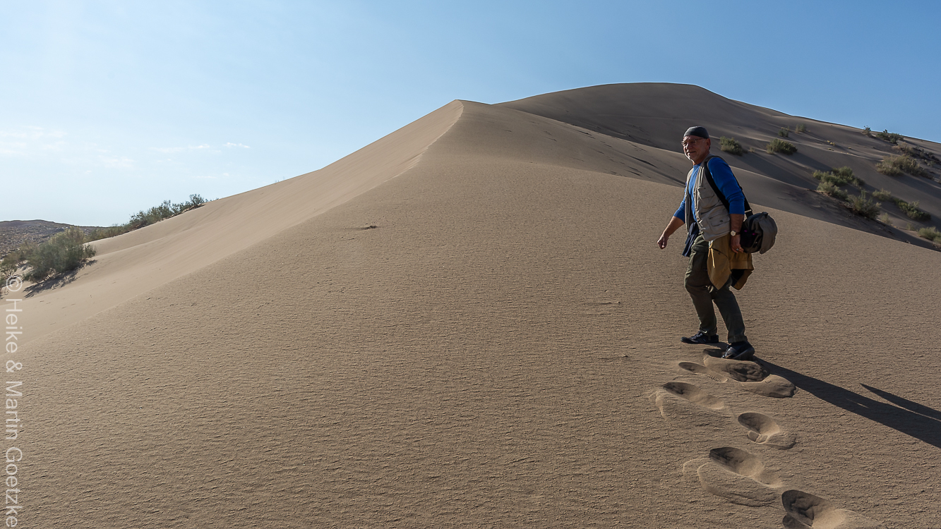 Den Eindruck hatte ich, als ich auf dem Dünenkamm lief. Ich bin nicht mit den anderen bis nach oben gelaufen, sondern allein zurück. Und die Absonderung hatte sich gelohnt! Es war still, total still, nur ein leises Summen, nicht tief, eher etwas hoch. Faszinierend! Singende Dünen! . . . . Moment . . . . Wenn ich den Kopf neige ist das Geräusch weg . . . . Es hat nicht lange gedauert und ich hatte die Ursache für den Dünengesang. Der Wind hat an dem Bändchen, das an den Bügeln meiner Sonnenbrille befestigt ist Summtöne hervorgebracht. Von wegen singende Dünen . . . . Der Spaziergang war dennoch schön.