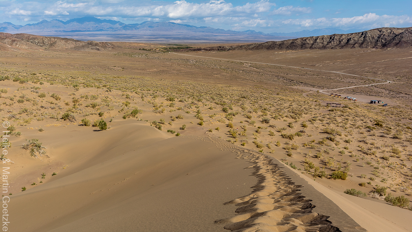 Hubschrauber starten hier zu Rundflügen, man kann Ferienhäuser buchen, Allradfahrzeuge mieten, der Parkplatz ist groß und bereits gut gefüllt.