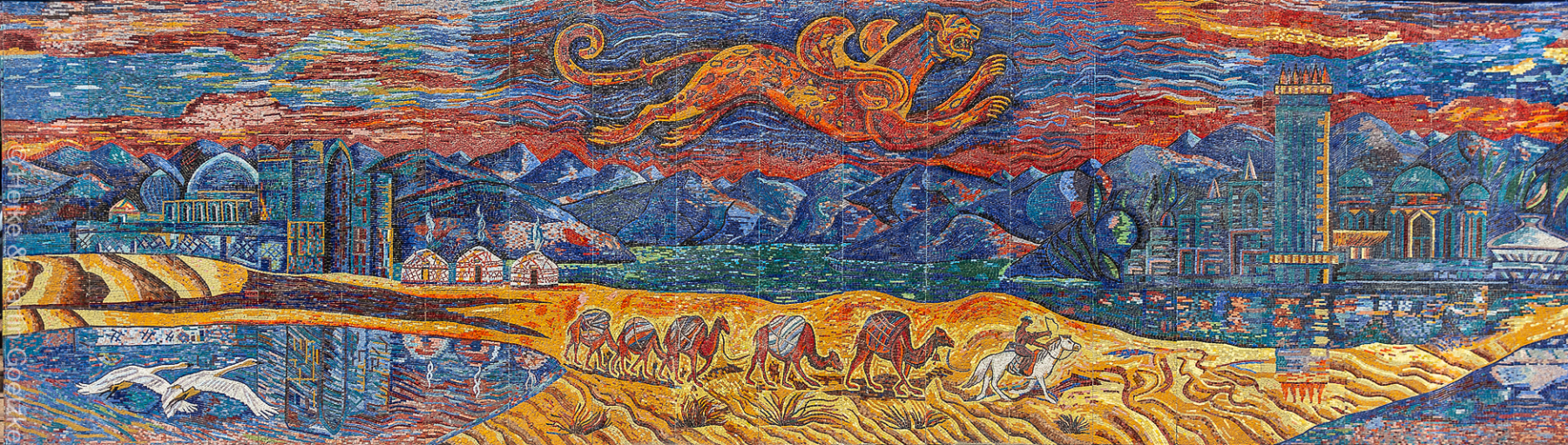 Ein in Almaty bekanntes und oft wiederholtes Mosaik stellt eine kasachische Romeo und Julia Tragödiue dar.