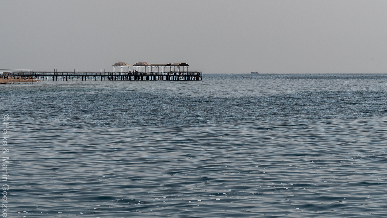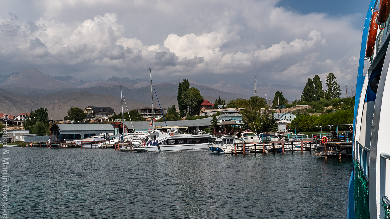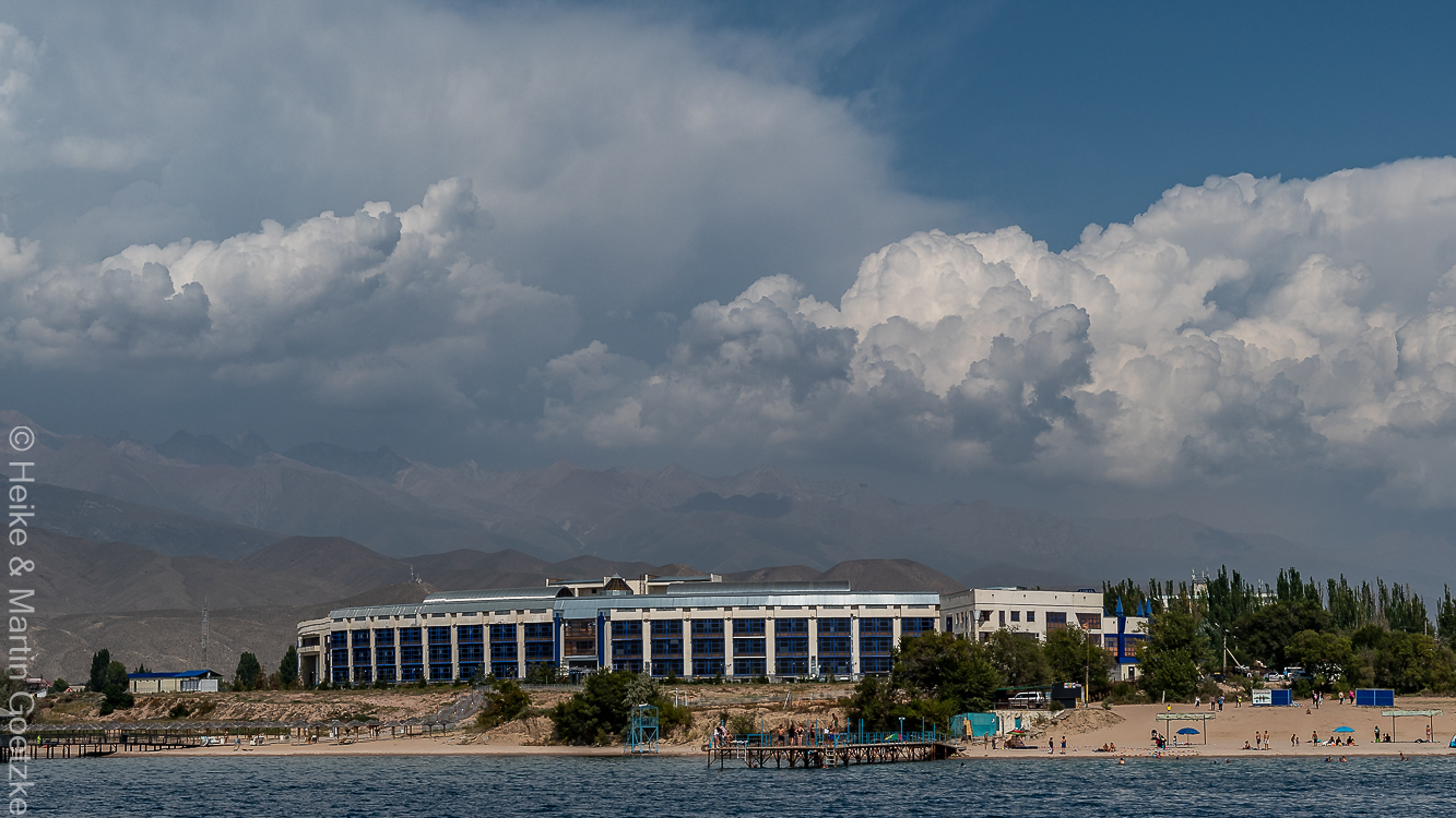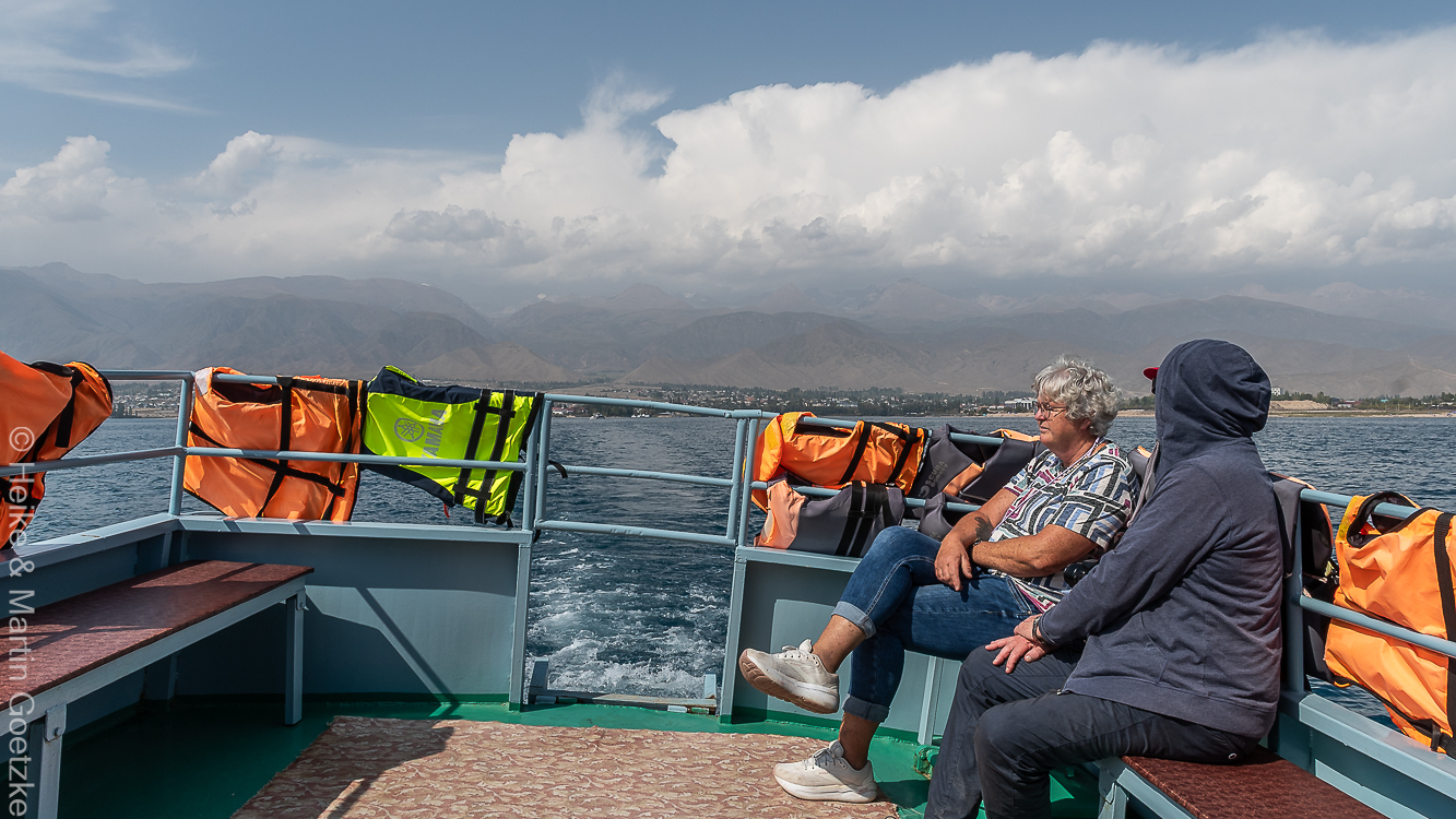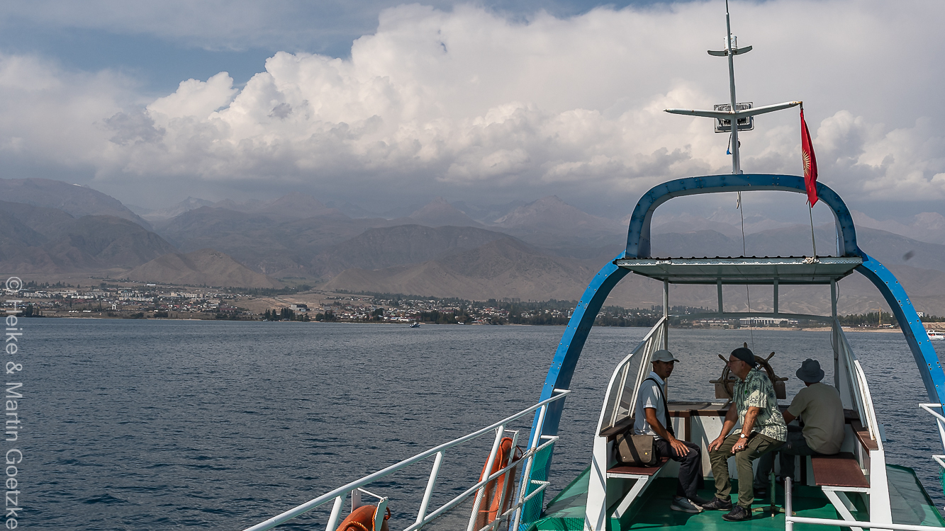 Der nächste Stopp ist der Issyk-Kul See, der zweitgrößte Gebirgssee der Welt. Der See gilt als zweitgrößter Bergsee weltweit nach dem Titicacasee. Er liegt etwas über 1500 m hoch, was für mich nicht wirklich eine gebirgige Höhe ist und die gesamt Optik macht auch nicht den Eindruck von Bergsee. Allerdings spricht die Größe für ihn, er hat eine Fläche von mehr als 6.000 qkm! Der Obersee des Bodensees hat zum Vergleich keine 500 qkm Fläche. Der Issyk-Kul scheint ein beliebtes Ausflug- und Urlaubsziel zu sein. Es ist etwas hektisch, wir kommen an und schnell, schnell zum Boot, es wartet schon. Grad‘ noch Zeit für die Toilette, die hier auch mal was kostet, wenn auch wenig.