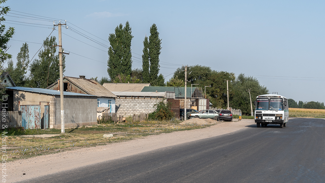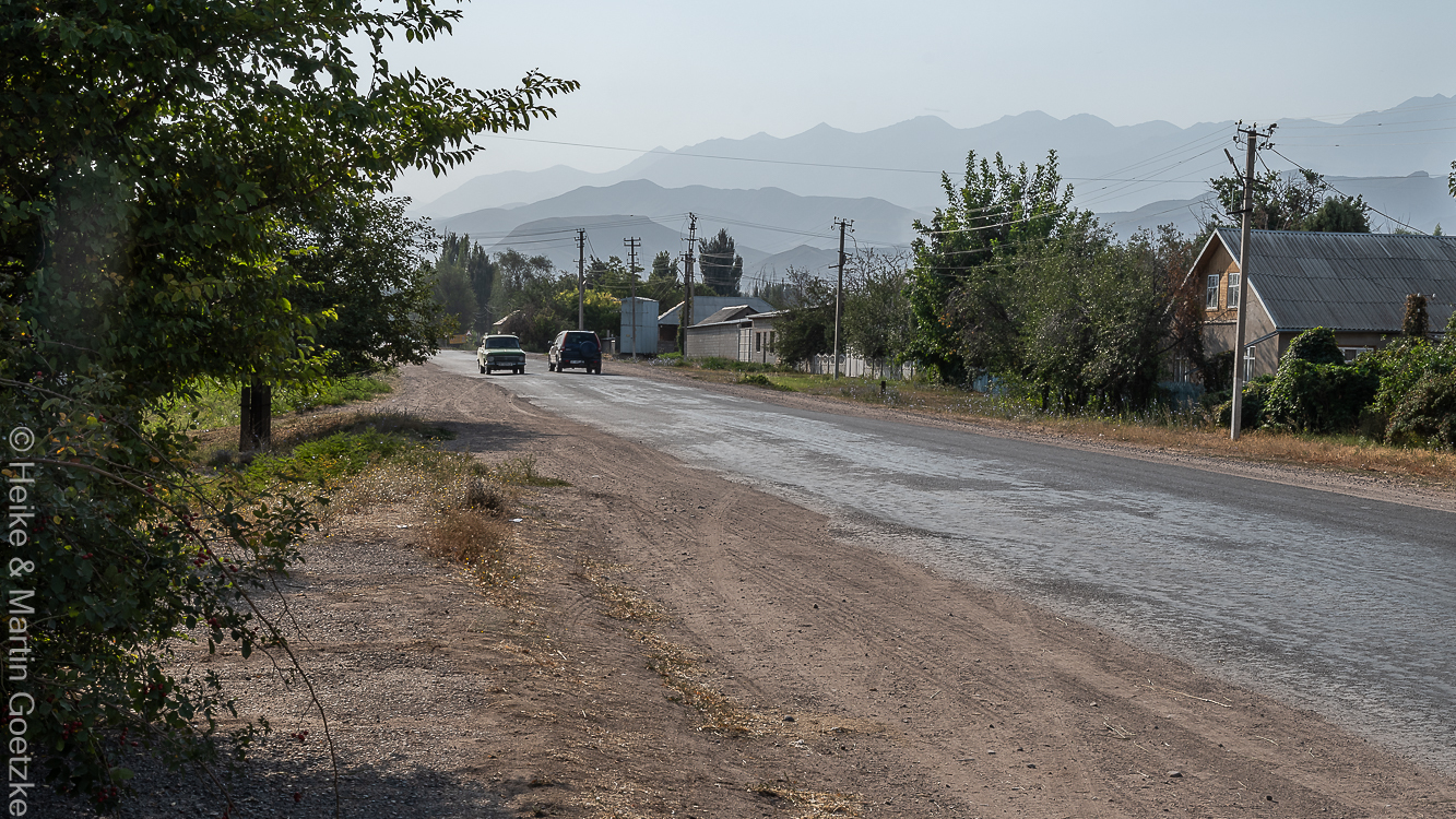 Bislang ist aufgefallen, dass wenig Radfahrer unterwegs sind, sowohl in Bishkek waren sie kaum im Straßenbild wahrzunehmen und auch nicht in den Dörfern, durch die wir gerauscht sind. Der Guide kommentiert dies trocken mit „Die Kirgisen sind ein Reitervolk, keine Radfahrer!“.