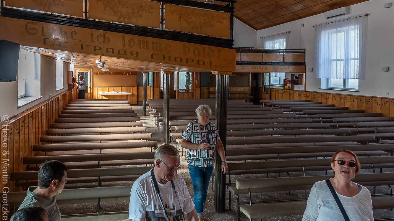 Um 10:00 Uhr soll es einen Gottesdienst geben. Wir können vorher die „Kirche“ von innen sehen und mit den eintrudelnden Gottesdienstbesuchern reden.