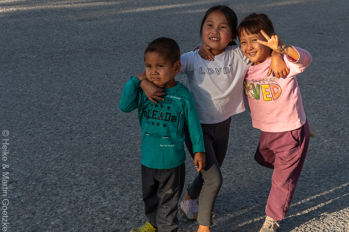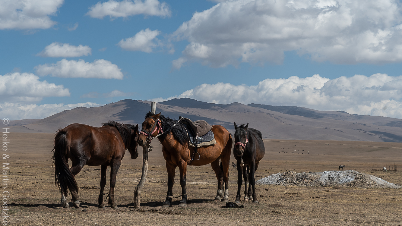 Auf das uigurische Nudelgericht verzichte ich der Nudeln wegen, meine Verdauung kämpft sehr mit der ungewohnten und außerdem sehr fleischlastigen Küche. Heute Morgen war es sehr kühl, hier auf 3.000 m ist es auch nicht gerade warm. Hoody und teilweise auch die Jacke sind allein gegen den Wind von Nöten. Nach dem Essen machen wir noch einen Spaziergang. Wir könnten, wenn wir wollten, Pferde mieten und damit durch die Steppe galoppieren. Mir ist sicherlich nicht danach. Und wenn ich so sehe, wie die drei jungen Damen mit ihren Gäulen kämpfen . . . mindestens einer macht nie was die Reiterin so will.