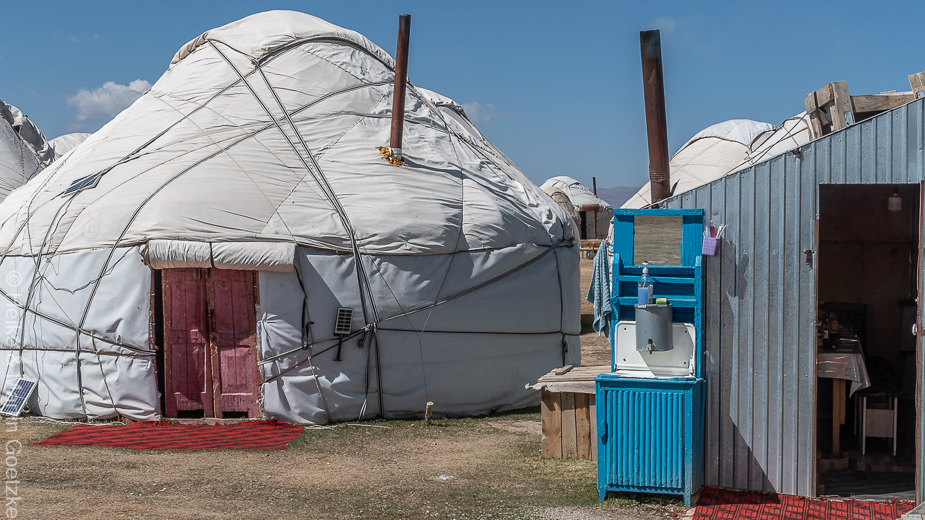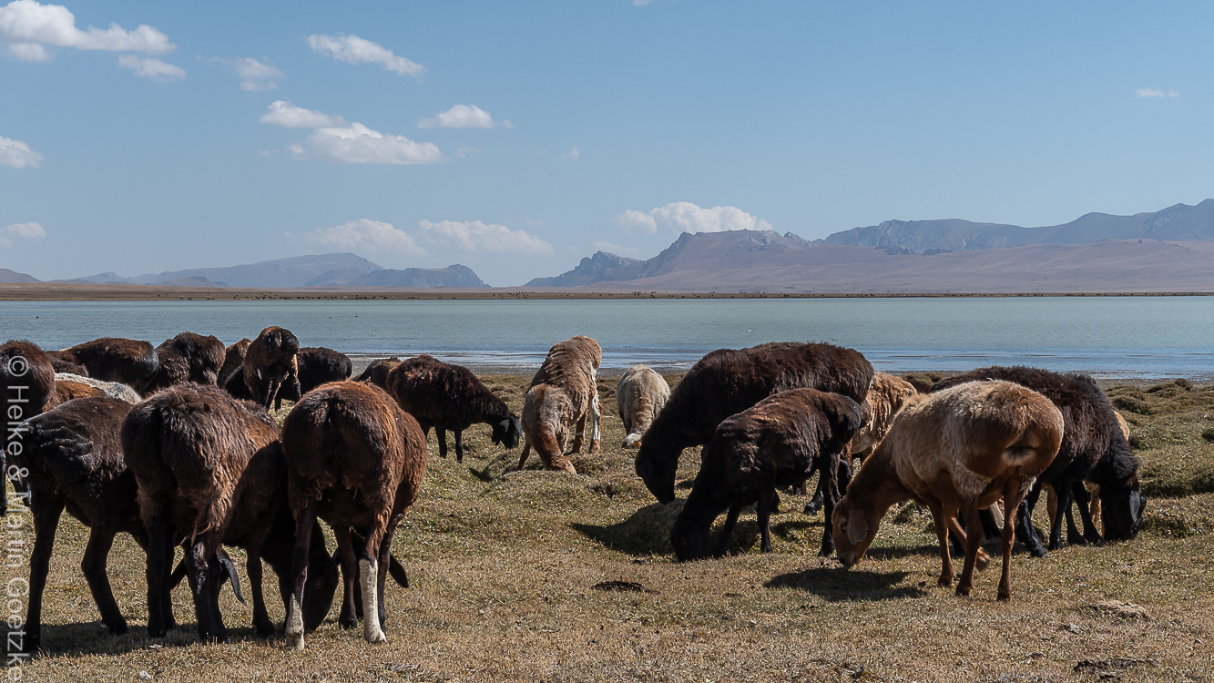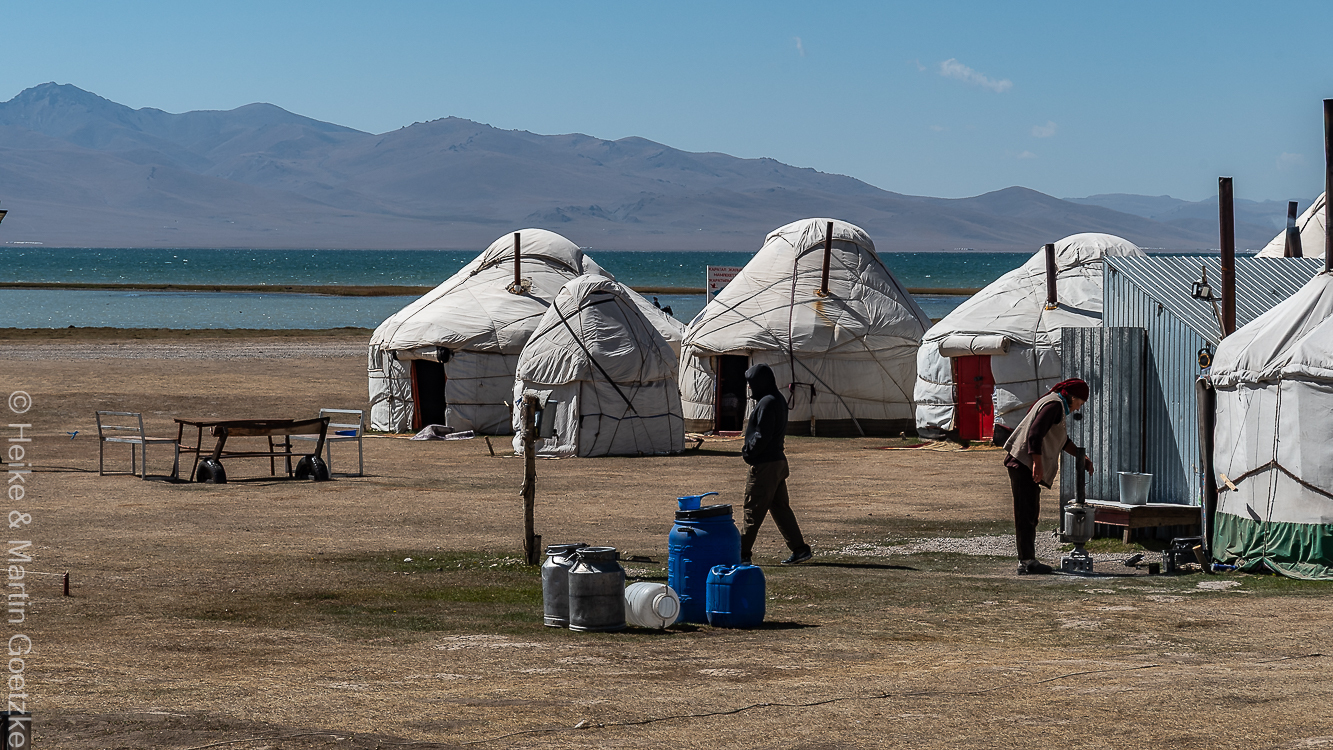 Wir sind Mittags am Son-Kul See und sollen hier ein Mittagessen bekommen. Bis es so weit ist machen wir für einen Spaziergang durch die Steppe und am Seeufer entlang. Hier kann man wirklich sehen, wer morgen kommen wird.
