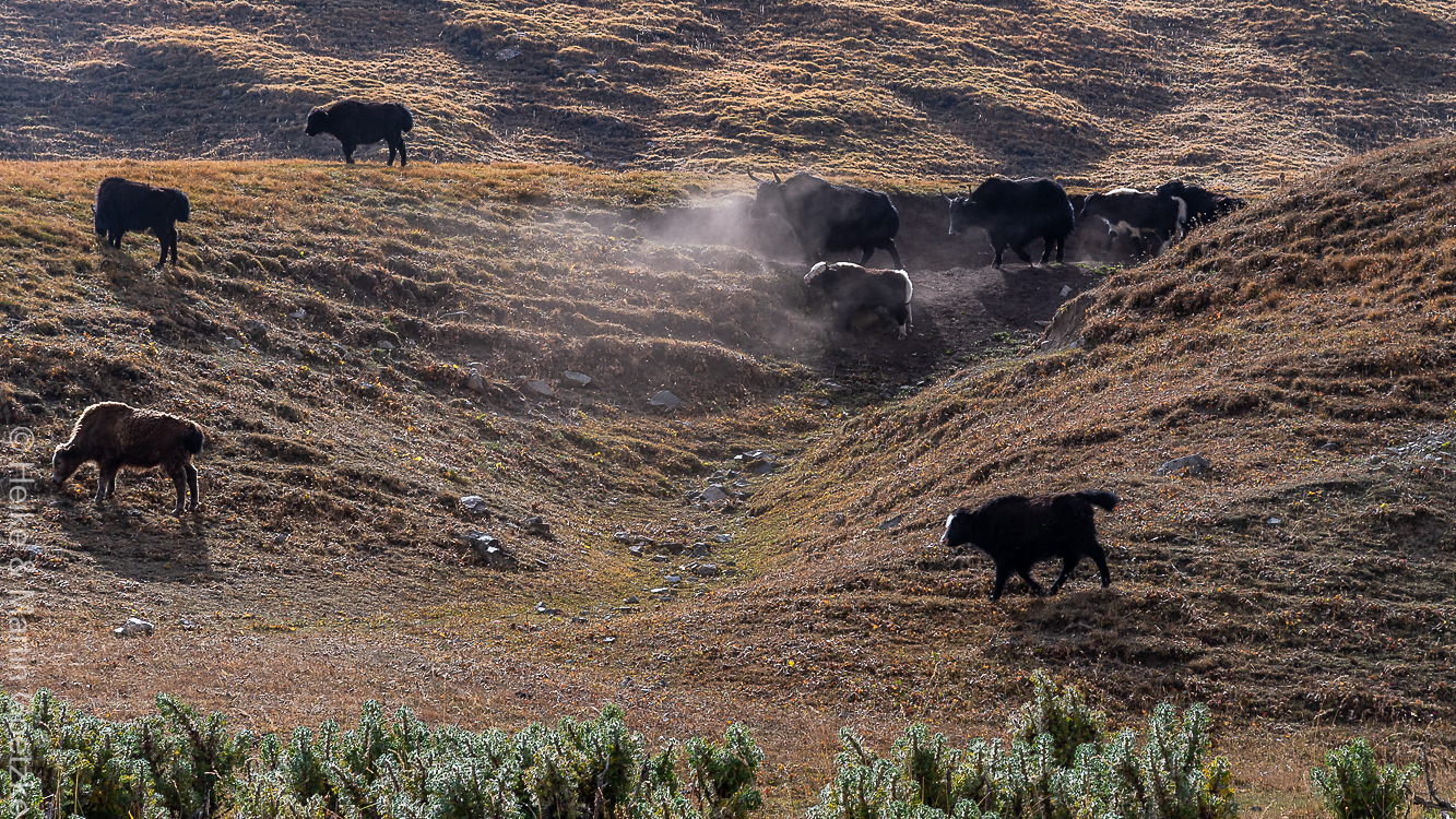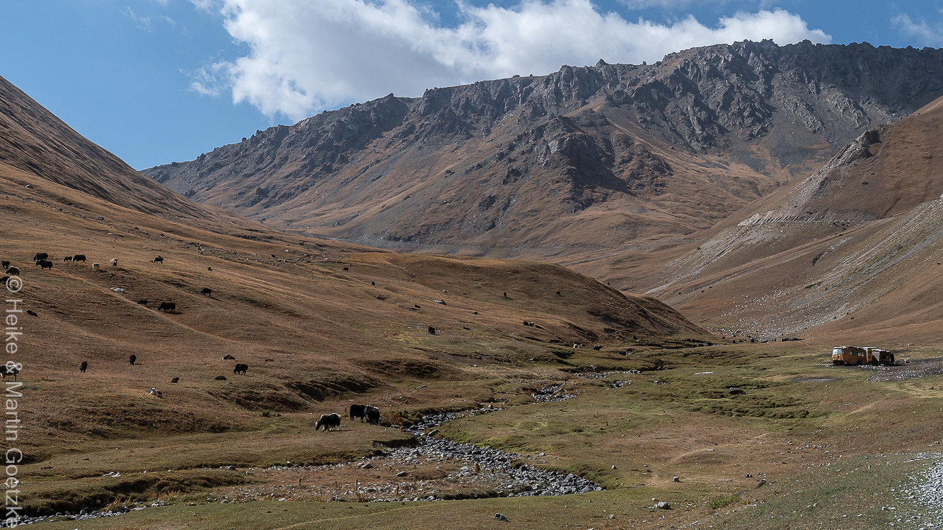 Für mich ist die Landschaft grandios, für andere vielleicht eintönig und langweilig. Aber ich bin dafür hierher gekommen! Gut, dass es mir heute besser geht. Hätte im Zustand von gestern die Eindrücke gar nicht genießen können. Während einer kurzen Pause können wir auch Yaks fotografieren.