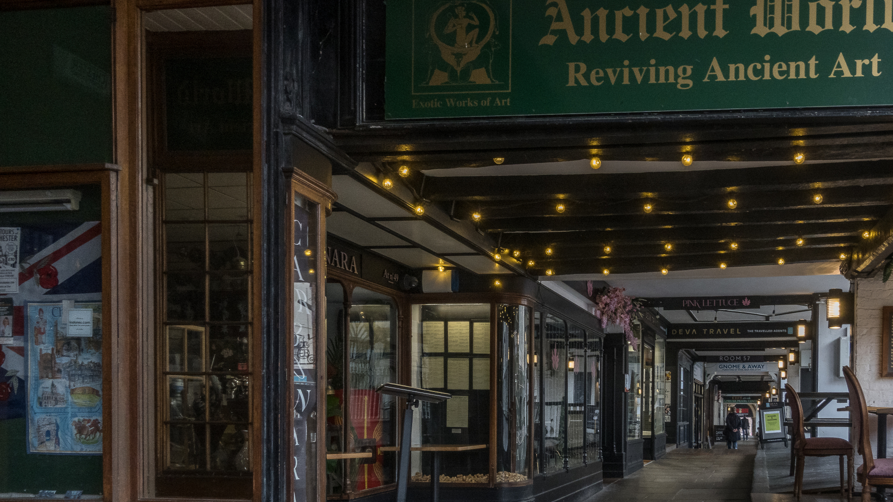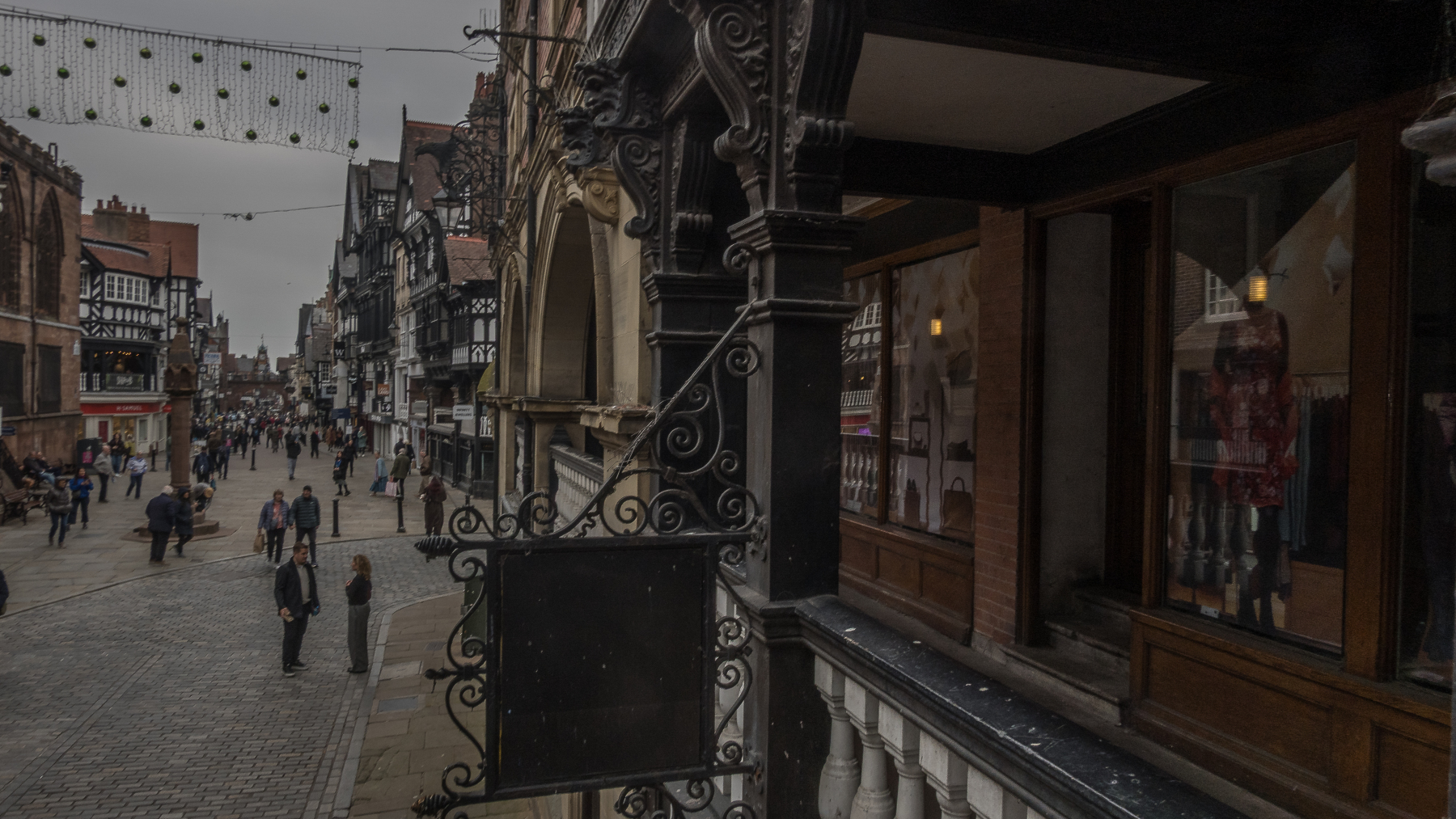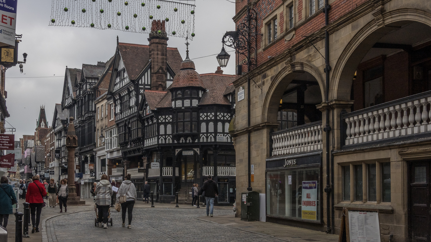Der eigentliche Höhepunkt in Chester sind die Rows. Häuser aus dem Mittelalter, der viktorianischen Zeit und allen Zeitabschnitten dazwischen bis heute, die das architektonische Prinzip der zweiten Ladenzeile im arkadenähnlichen Obergeschoß fortgesetzt und bis heute erhalten haben. Die Häuser sehen zum Teil hinreißend aus. Fantastische Fachwerkkonstruktionen. Die Geschäfte darinnen sind decken die ganze Spannbreite zwischen mondän, über kitschig, touristisch bis normal ab. Wir laufen aus lauter Spaß an der Sache fast ausschließlich im Obergeschoß herum.