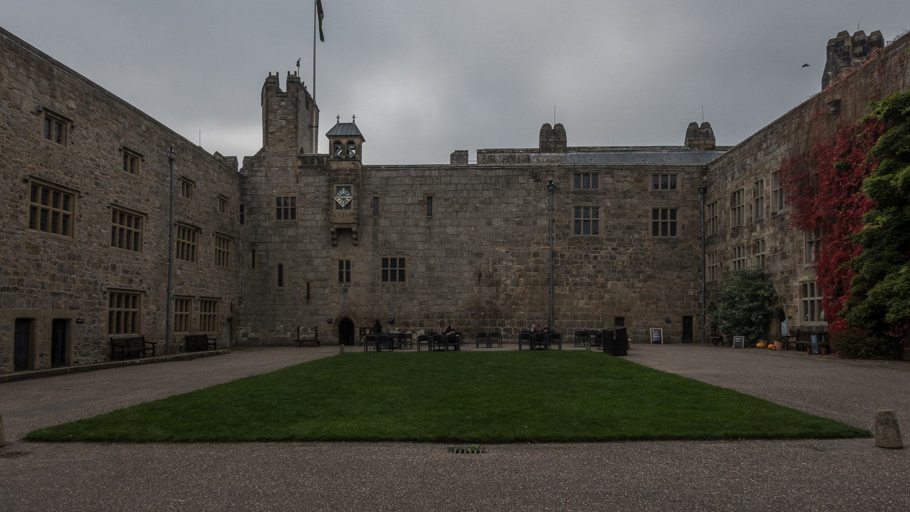 Wir sind früh dran und entscheiden uns für einen kurzen Besuch im Chirk Castle. Das Castle, das den Programmpunkt besetzt hat, der dem Felgenschaden zum Opfer gefallen ist. Wir haben nur eine 3/4 Stunde Zeit und müssen uns eilen, von der Kasse zum Castle hochzulaufen. Im Ergebnis sind wir der gleichen Meinung. Das Castle selber war mit der zur Verfügung stehenden Zeit ausreichend bedacht. Der allergrößte Teil kann wieder nicht besichtigt werden, private Nutzung. Der Rest ist ziemlich dunkel und irgendwie . . . . wenn man eines dieser Castles von innen gesehen hat, ähneln sich die meisten ziemlich stark und die Unterschiede zu erkennen ist für einen Menschen, der nicht in den Details der ausgestellten Bilder und Möbelstücke aufgeht, sehr problematisch. Aber, auch da sind sich diese Monumentalbauten ziemlich ähnlich, das Castle liegt fantastisch in der Landschaft. Allein die Sicht ist wg. des diesigen Wetters leider nicht ganz so spektakulär. Heike läuft von der Pforte des Castles zurück zum Campingplatz, der Fotos wegen.